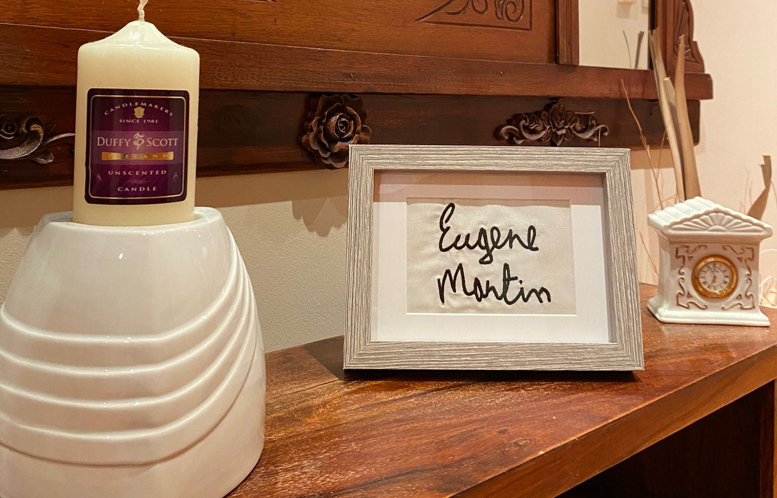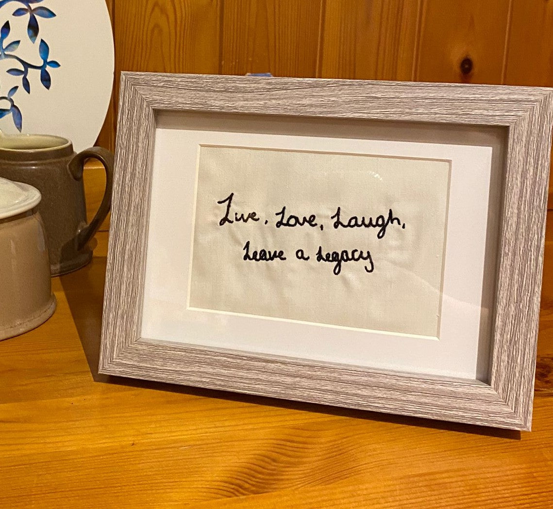 From heartfelt words of a loved one who has passed, everyday scribbles, birthday cards wishes, or your child's first drawings, every piece can become a Forever in Thread piece which can be kept close for a lifetime.